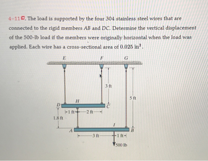| Read The Load Is Supported The Four 304 Stainless Steel Wires That Are Connected To The Rigid Members Ab And Dc Determine The Vertical Displacement Of The 500 Lb Load If The Members |